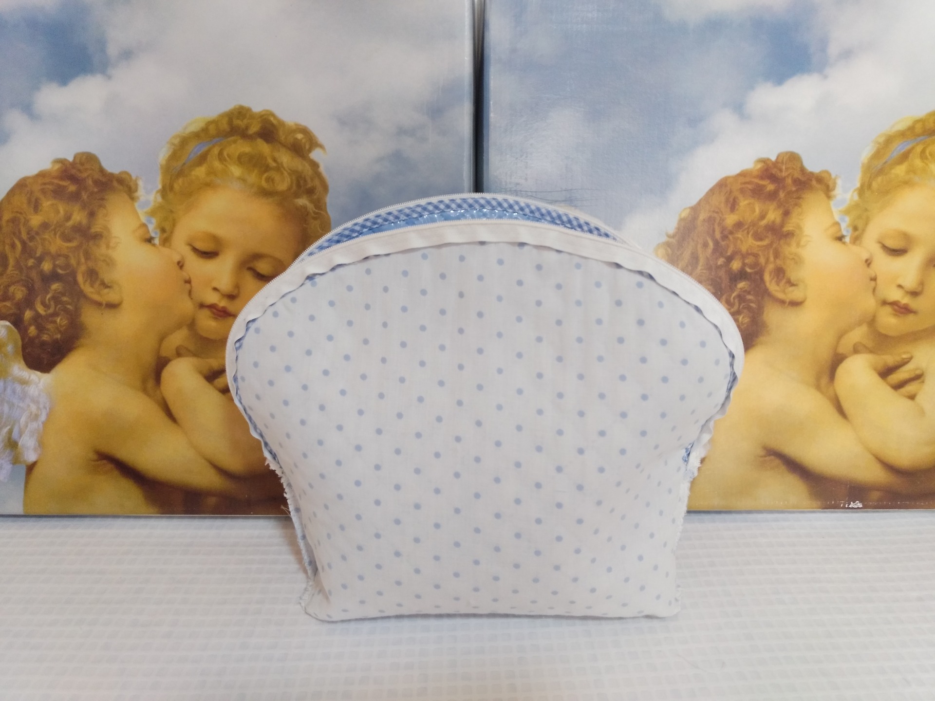 LA SEGUNDA IMAGEN ES EL REVÉS que está forrado de tela blanca con topitos azules (que es el color de la bolsa de aseo)