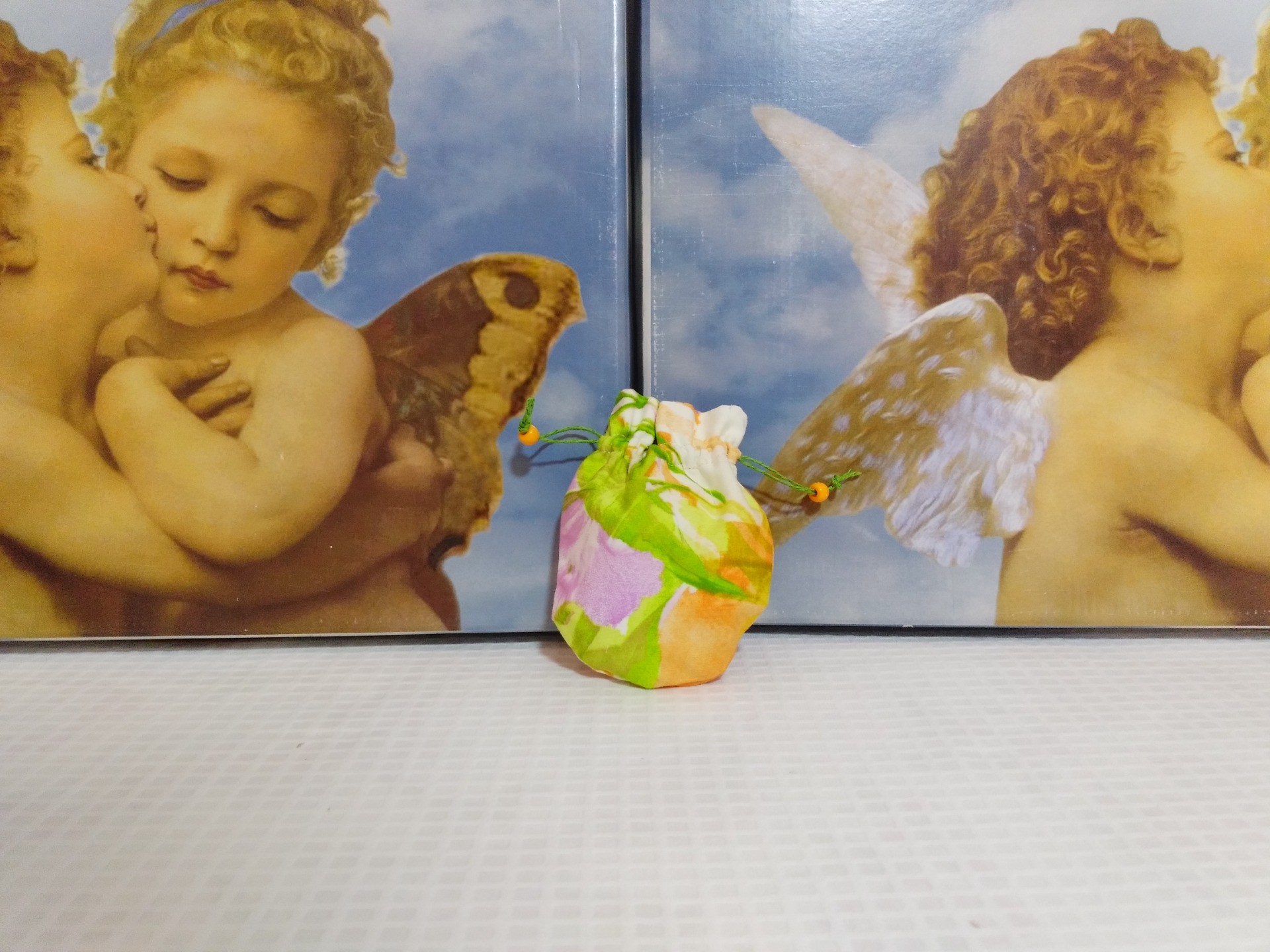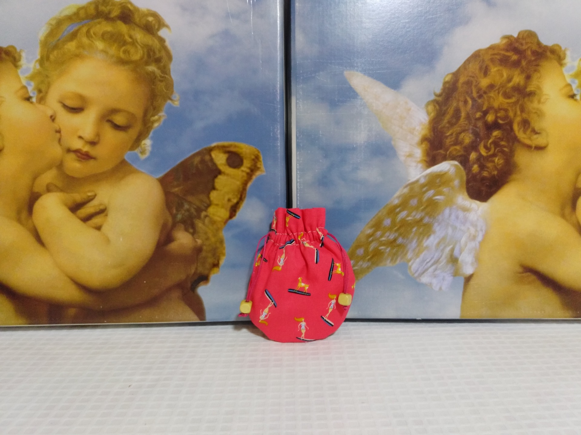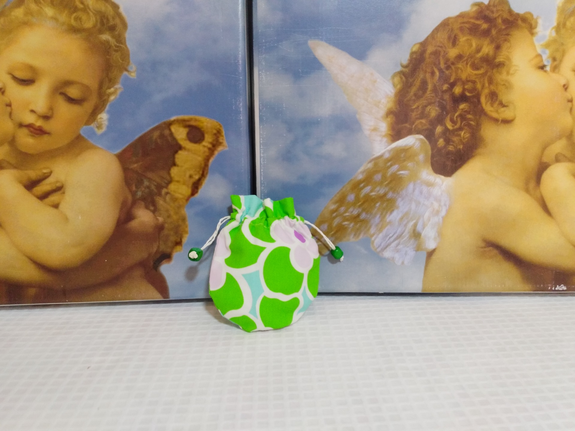 Bolsita azul riveteada con bies de cuadritos azules de vichy, con tela plastificada y con un adorno azul 8,99 € 0,00 €