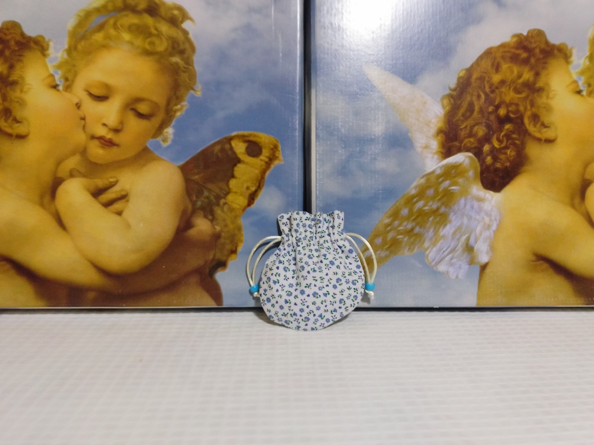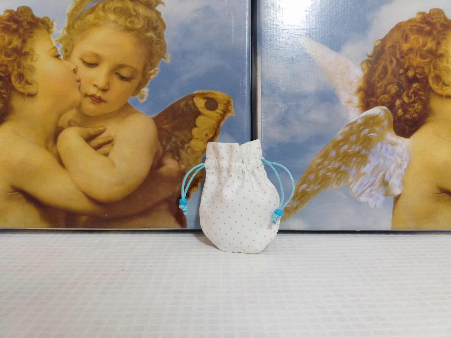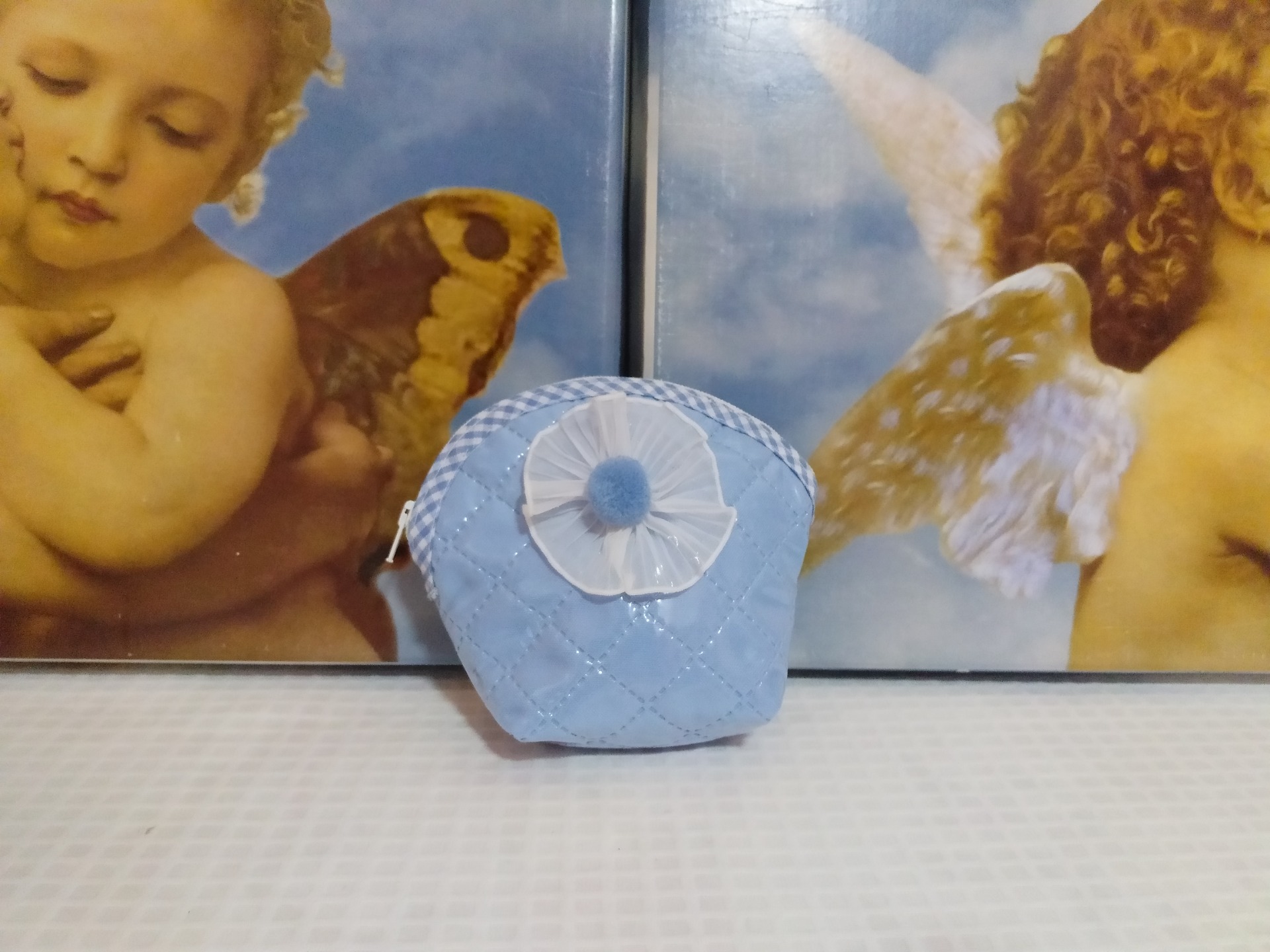 Bolsita azul riveteada con bies de cuadritos azules de vichy, con tela plastificada y con un adorno azul 8,99 € 0,00 €
